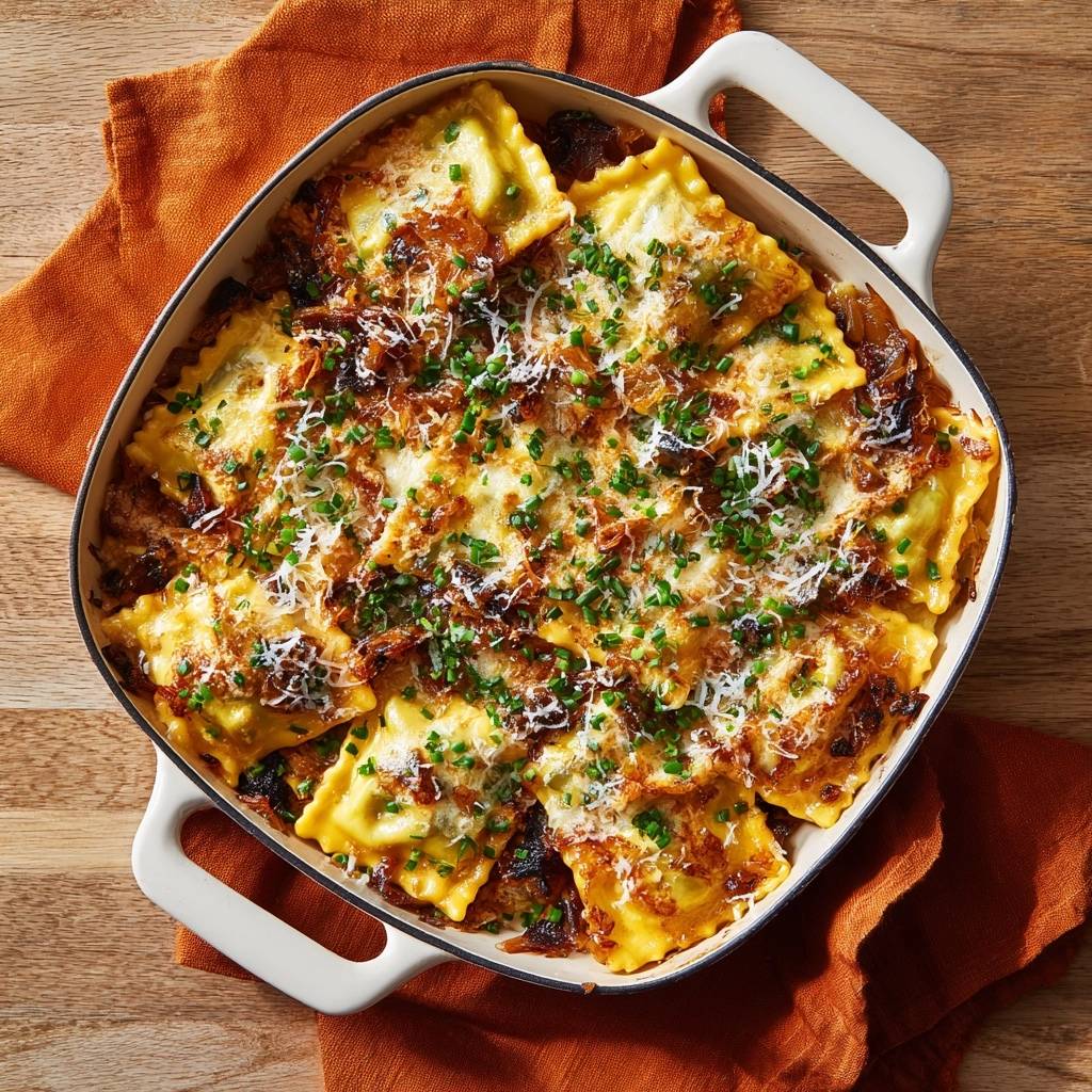 - Ravioli nicht vorkochen – das ist der Game-Changer gegen Matsch! Sie trocken und gefroren (falls TK) in eine gefettete ovale Gusseisenform (ca. 30×20 cm) eng verteilen. Karamellzwiebeln gleichmäßig darüberstreichen, damit die Ravioli Flüssigkeit saugen und innen weich, außen knusprig garen.