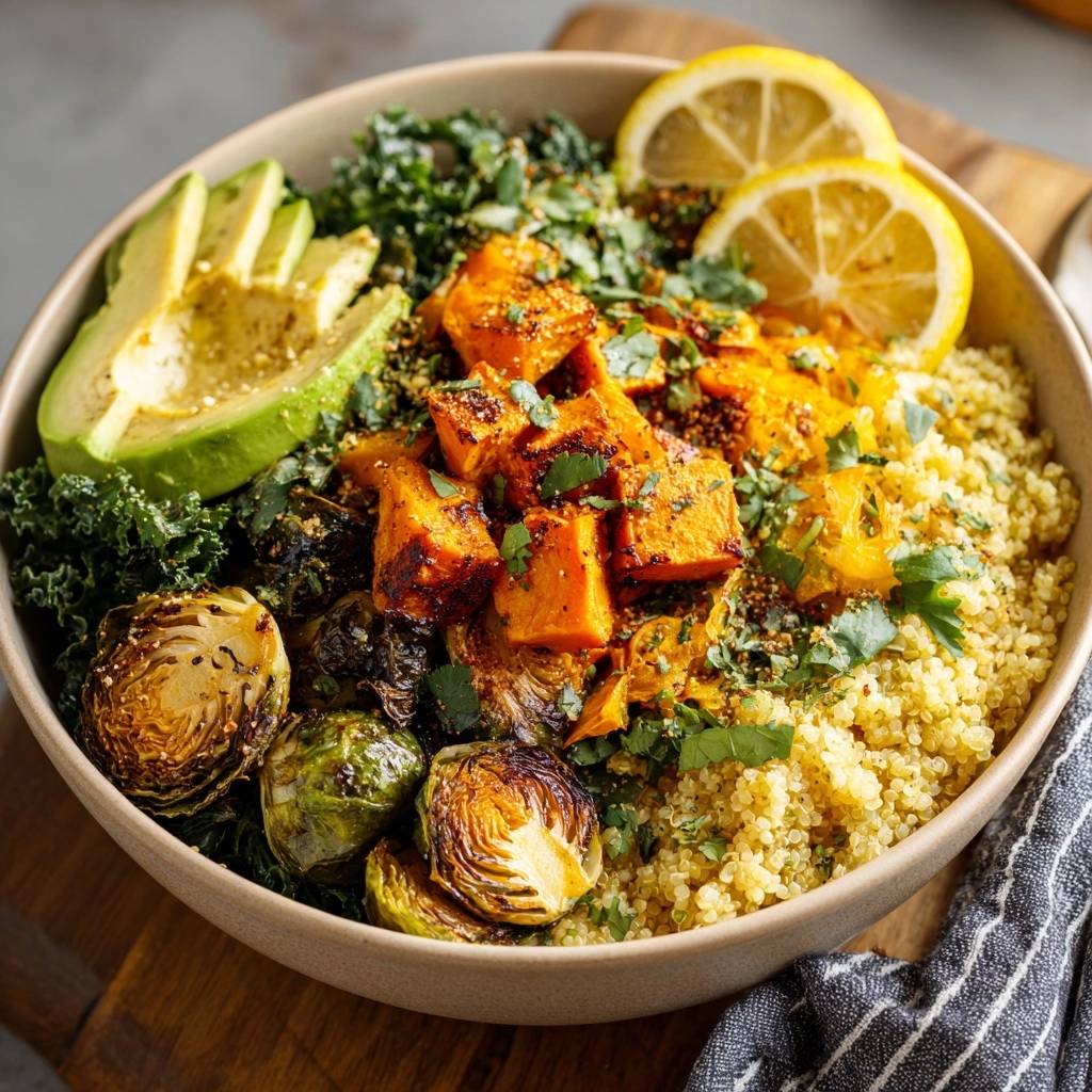Diese Bowl rockt, weil sie vegan ist, nährstoffreich und super anpassbar. Quinoa gibt Protein, Rosenkohl und Süßkartoffeln liefern Ballaststoffe und Süße. Ein Spritzer Zitrone weckt alles auf. Du fühlst dich energiegeladen, ohne schwer im Magen zu sitzen. Probier sie, und du wirst nie wieder fade Gemüse backen.