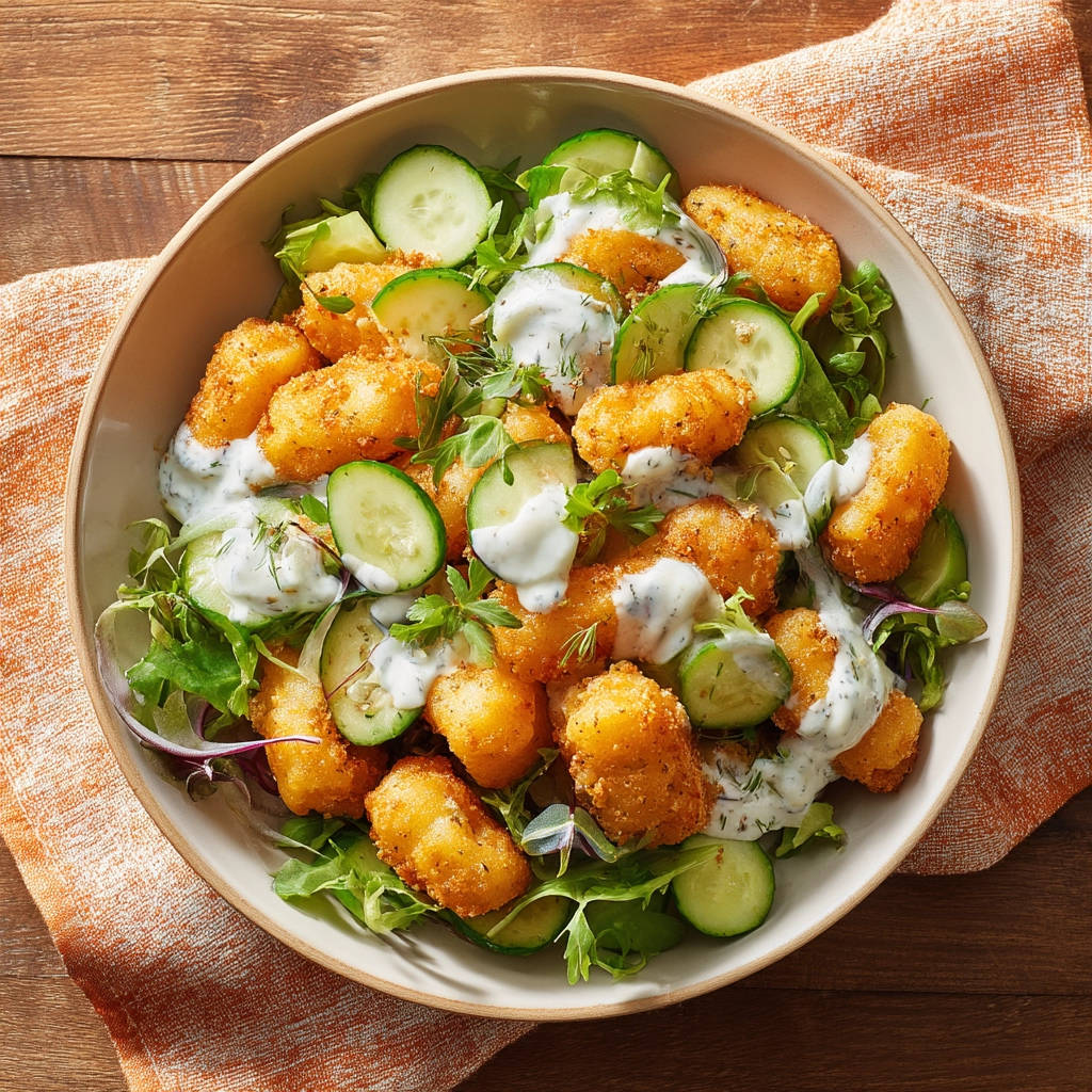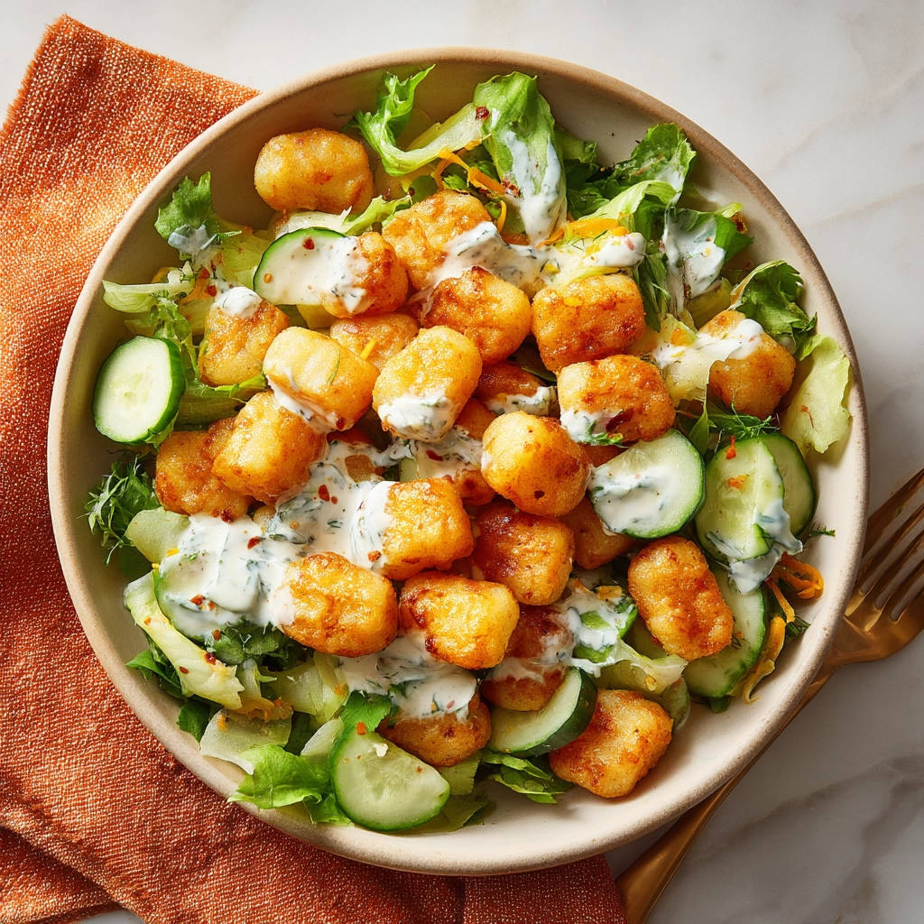 - Der entscheidende Knusper-Schritt: Die Kartoffel-Bites hinzufügen: Sobald die Kartoffel-Bites perfekt goldbraun und super knusprig aus dem Ofen oder der Heißluftfritteuse kommen, ist der wichtigste Moment gekommen. Geben Sie die noch heißen, knusprigen Kartoffel-Bites erst JETZT – wirklich erst in dem Moment, in dem Sie den Salat tatsächlich servieren möchten – zum vorbereiteten Salat in die Schüssel. So vermeiden Sie, dass die Hitze und Restfeuchtigkeit der Kartoffeln den Salat welk machen oder die Kartoffeln selbst Feuchtigkeit aus dem Salat ziehen und weich werden.
