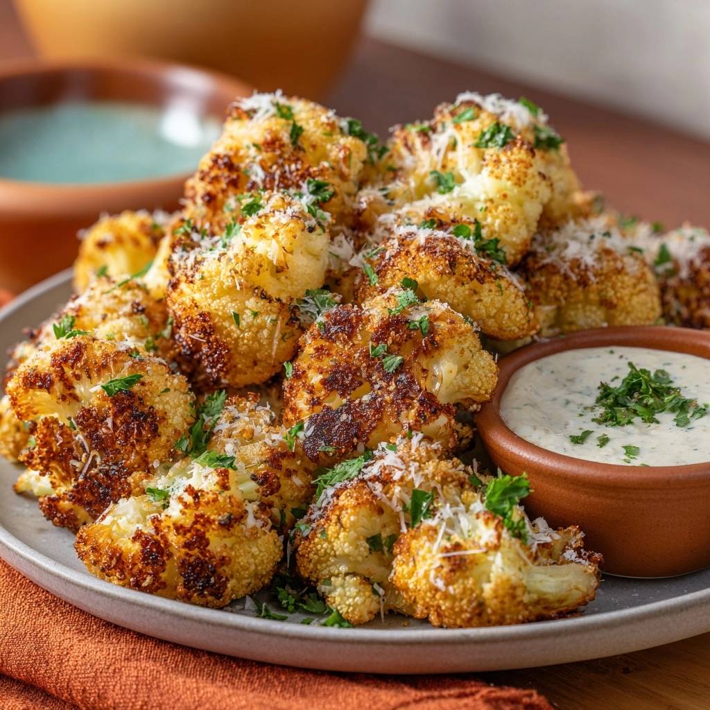 Knuspriger Parmesan-Blütenkohl mit Kräuter-Dip – Rezept