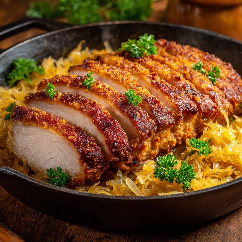 Variation: Ohne Sauerkraut? Gleiches Anbraten, dann mit Brühe garen. Kruste bleibt top.