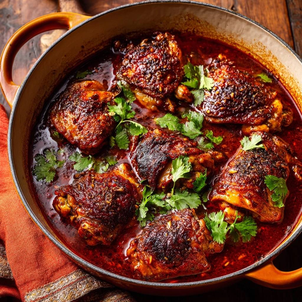 Stell dir vor, du beißt in den ersten Hähnchenschenkel, und die Haut knackt so herrlich, als würde sie dir ein Geheimnis zuflüstern. Darunter saftiges Fleisch, das in einer würzigen Tomatensoße badet, voller Chili und geräuchertem Paprika. Ich hab das früher anders gekannt. Meine ersten Versuche endeten immer in matschiger Enttäuschung: Die Haut wurde weich, sobald das Hähnchen in die Soße wanderte. Stundenlang geschmort, und am Ende nur Brei.
