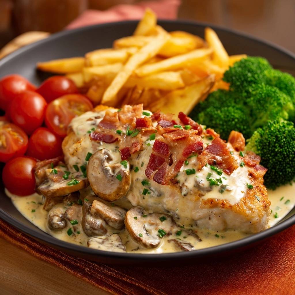 Stell dir vor, du nimmst den ersten Bissen von diesem knusprigen Hähnchen. Außen knackig goldbraun, innen so saftig, dass der Saft nur so herausläuft. Die cremige Pilz-Bacon-Rahmsauce umhüllt alles mit ihrem rauchigen Aroma, Pilze geben erdige Tiefe, und der Bacon-Kick macht es unwiderstehlich.