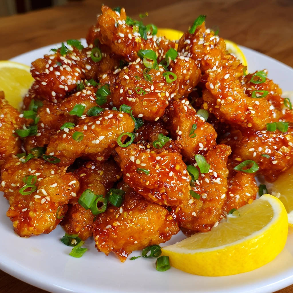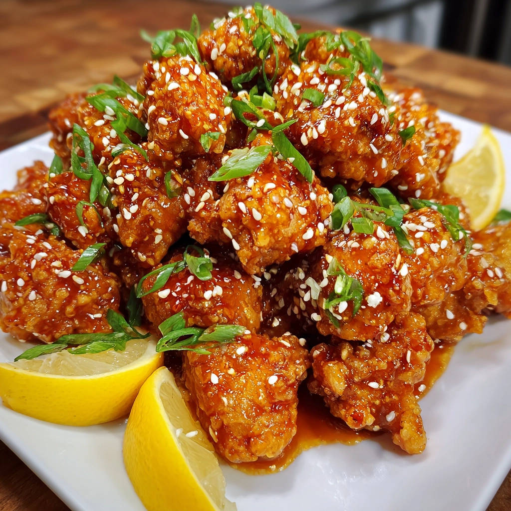 Servieren und Garnieren: Richte das knusprige Hähnchen in süß-saurer Sauce auf einer Servierplatte an. Bestreue es großzügig mit Sesamsamen und den gehackten Frühlingszwiebelringen für zusätzlichen Geschmack und eine schöne Optik. Serviere das Gericht mit Zitronenspalten, die je nach Belieben über das Hähnchen geträufelt werden können, um die Säure zu betonen. Am besten schmeckt es sofort!