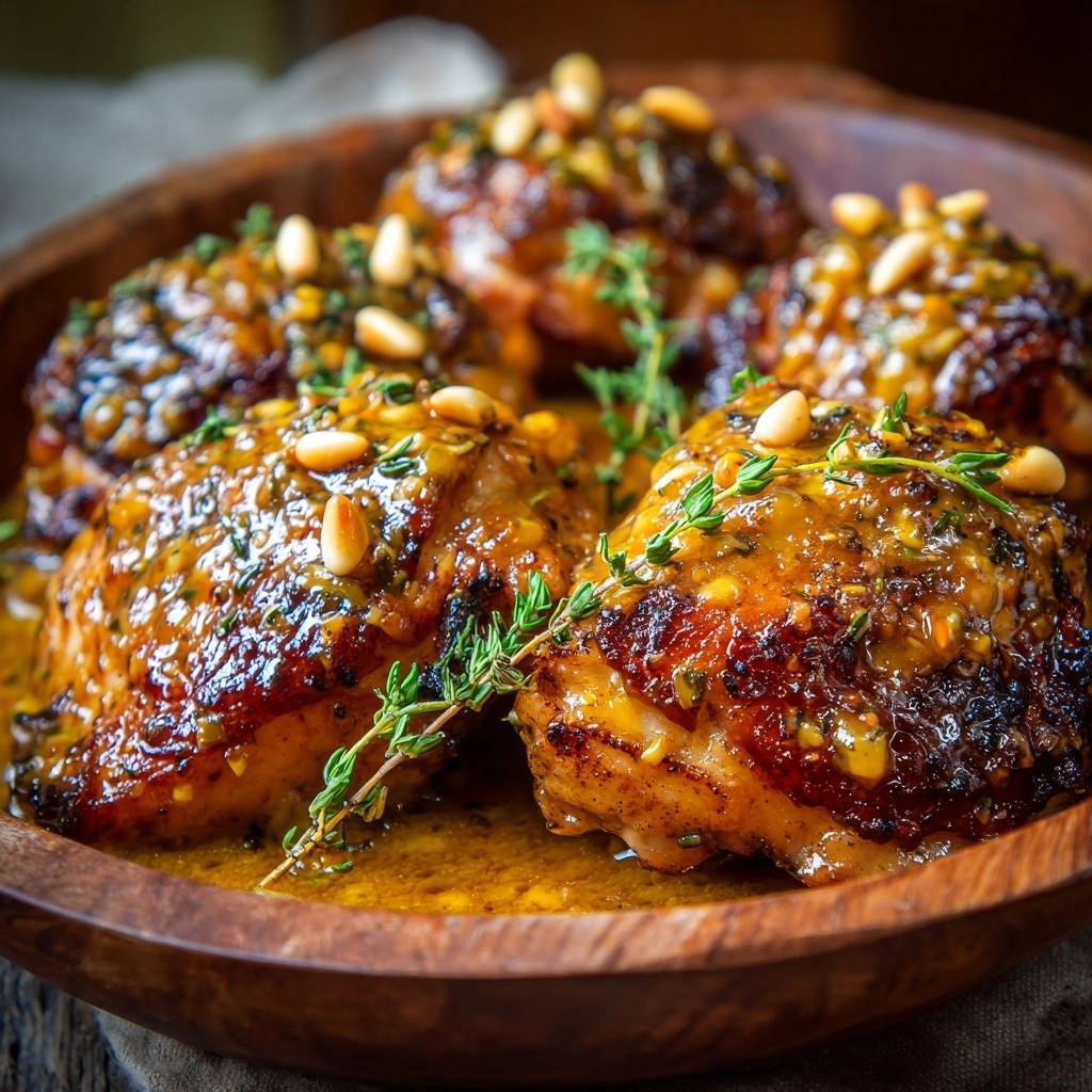 Stell dir vor, du beißt in die goldbraune, knusprige Haut. Darunter verbirgt sich saftiges Fleisch, das vor Honigaroma und Thymian duftet. Der erste Bissen explodiert im Mund: Nussig von den Pinienkernen, süß-säuerlich und total zart.