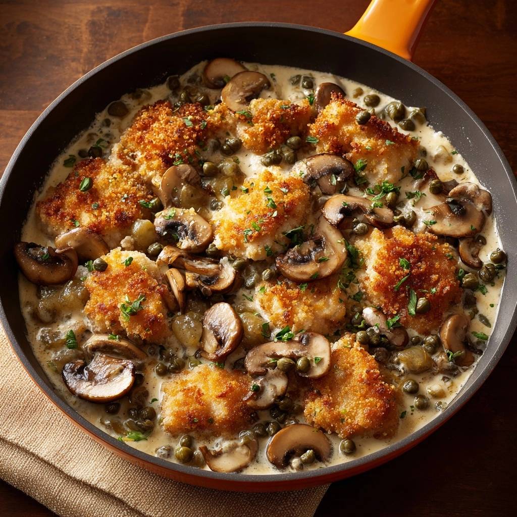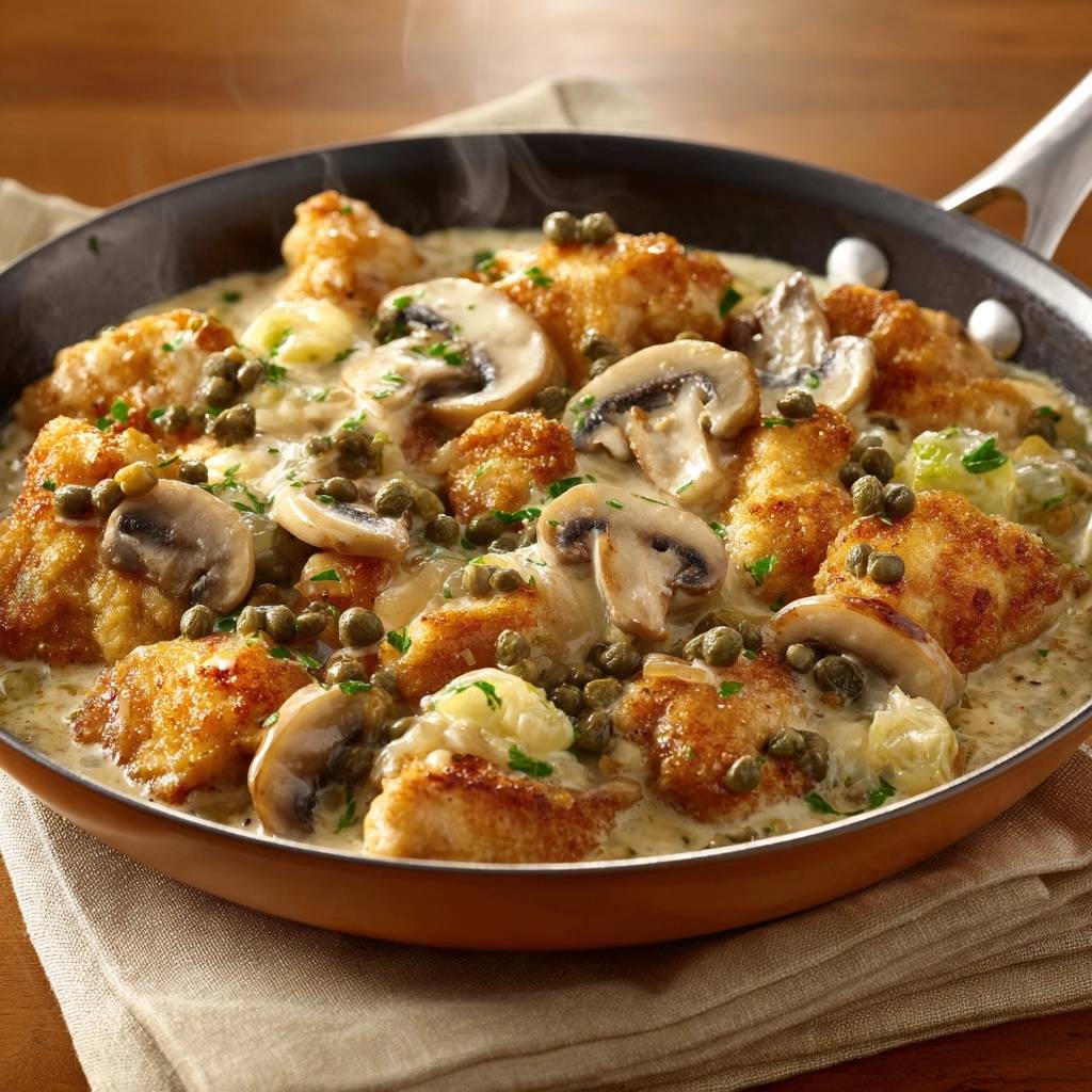 Knuspriges Panierhähnchen mit Champignons, Kapern & Sahnesoße
