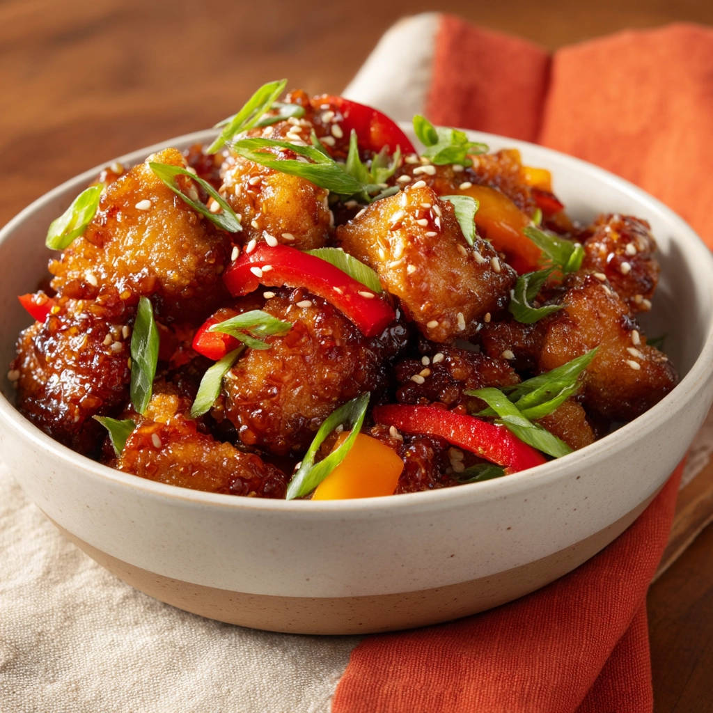 - – Für die extra Knusprigkeit das Öl auf etwa 180-190°C erhitzen. Die Hähnchenstücke erneut für 1-2 Minuten frittieren, bis sie sehr knusprig sind. Wieder herausnehmen und abtropfen lassen. Dieser zweite Frittiervorgang ist entscheidend für die Knusprigkeit, die auch in der Soße hält!