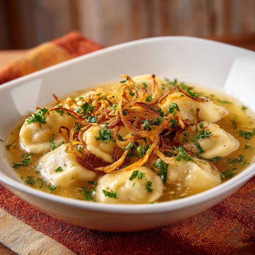 Maultaschen in goldener Brühe mit knusprigen Zwiebeln