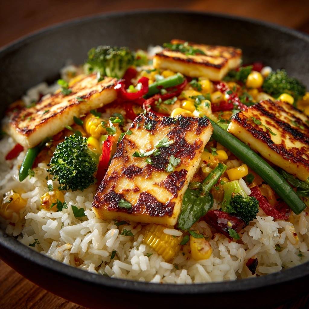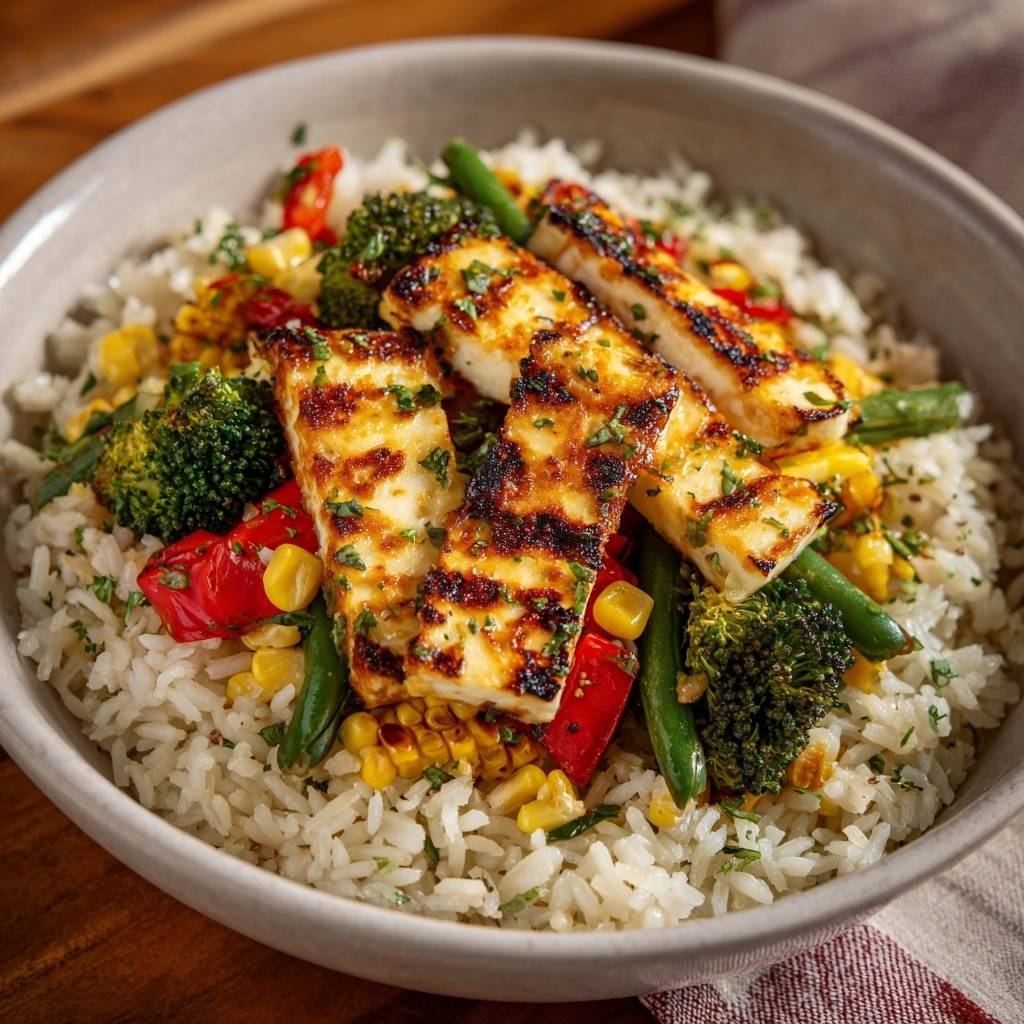 Mediterrane Halloumi-Bowl auf buntem Gemüsereis