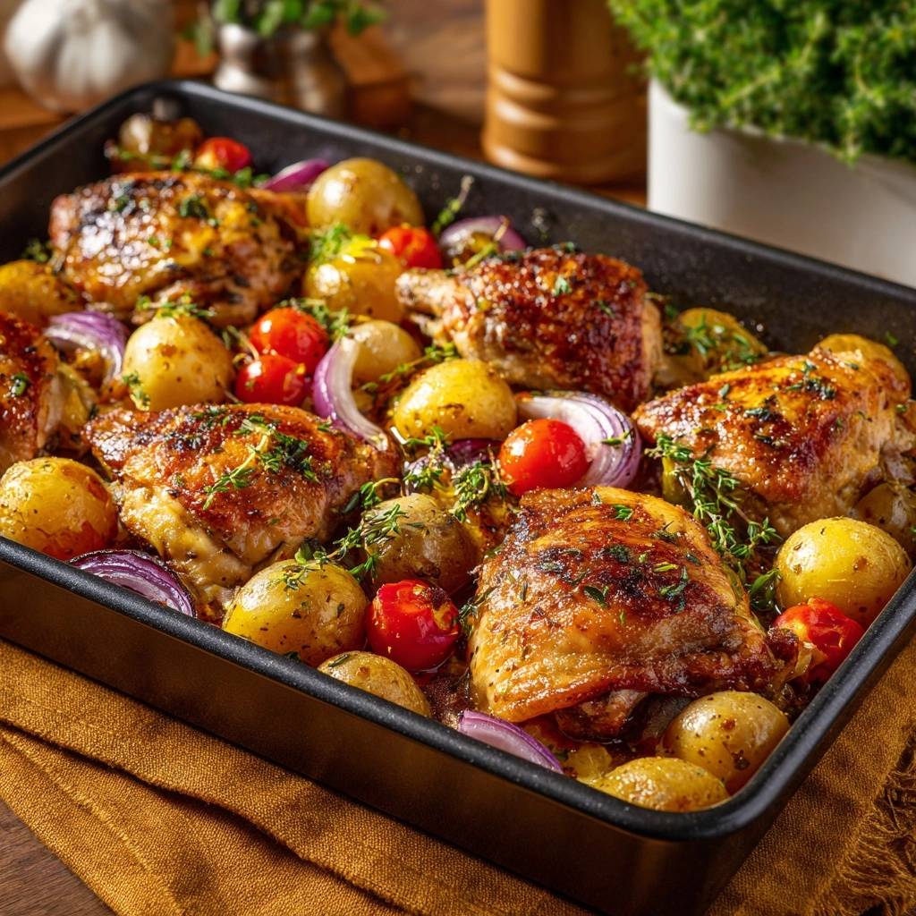 Stell dir vor, du öffnest die Ofentür und dir schlägt dieser Duft von frischem Thymian, geröstetem Knoblauch und krossem Hähnchen entgegen. Das Blech zischt noch leise, während die Tomaten gerade so weit aufgeplatzt sind, dass ihr süßer Saft die Kartoffeln glasiert.