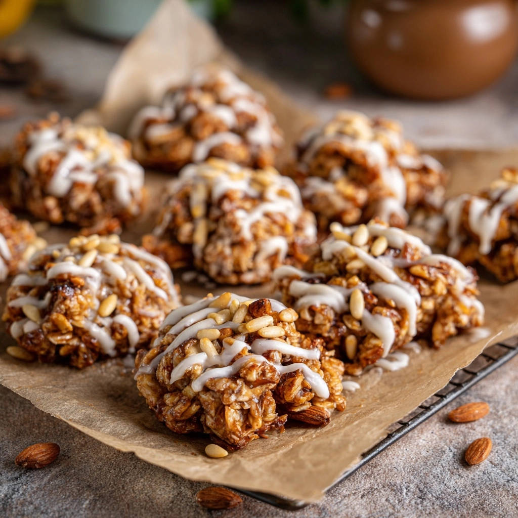 - Sobald die Nuss-Samen-Cluster vollständig ausgekühlt und hart sind, kannst du sie vorsichtig vom Backpapier lösen. Sie sollten sich nun mühelos abheben lassen. Beträufle sie anschließend mit der Puderzuckerglasur. Lass die Glasur kurz antrocknen, bevor du die Cluster servierst oder in einer luftdichten Dose aufbewahrst. So hast du knusprige, perfekte Cluster ganz ohne Kleben!