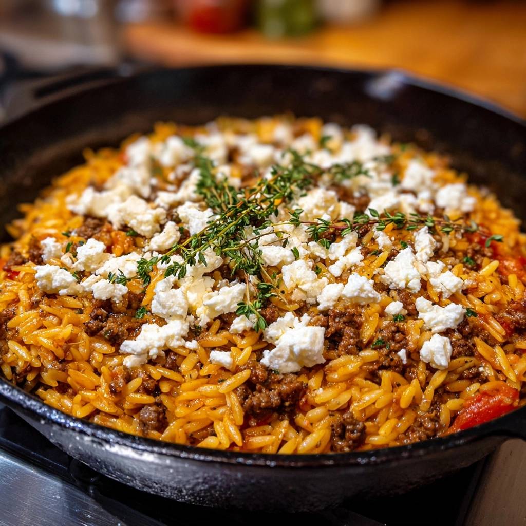 One-Pot-Orzo mit Hack, Paprika und Feta (Nie wieder matschige Nudeln)