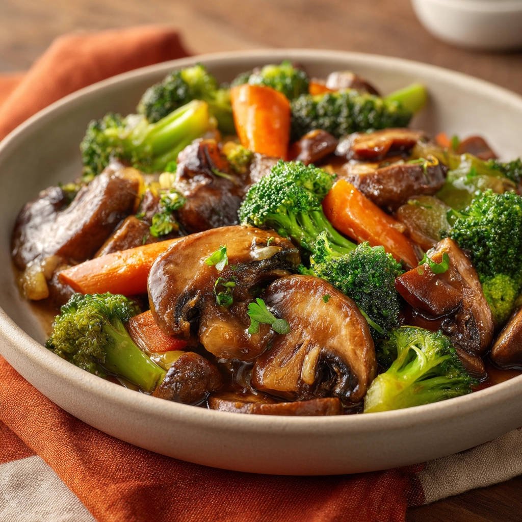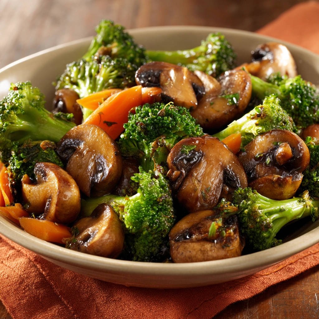 Gebratenes Gemüse mit Brokkoli, Champignons und Karotten