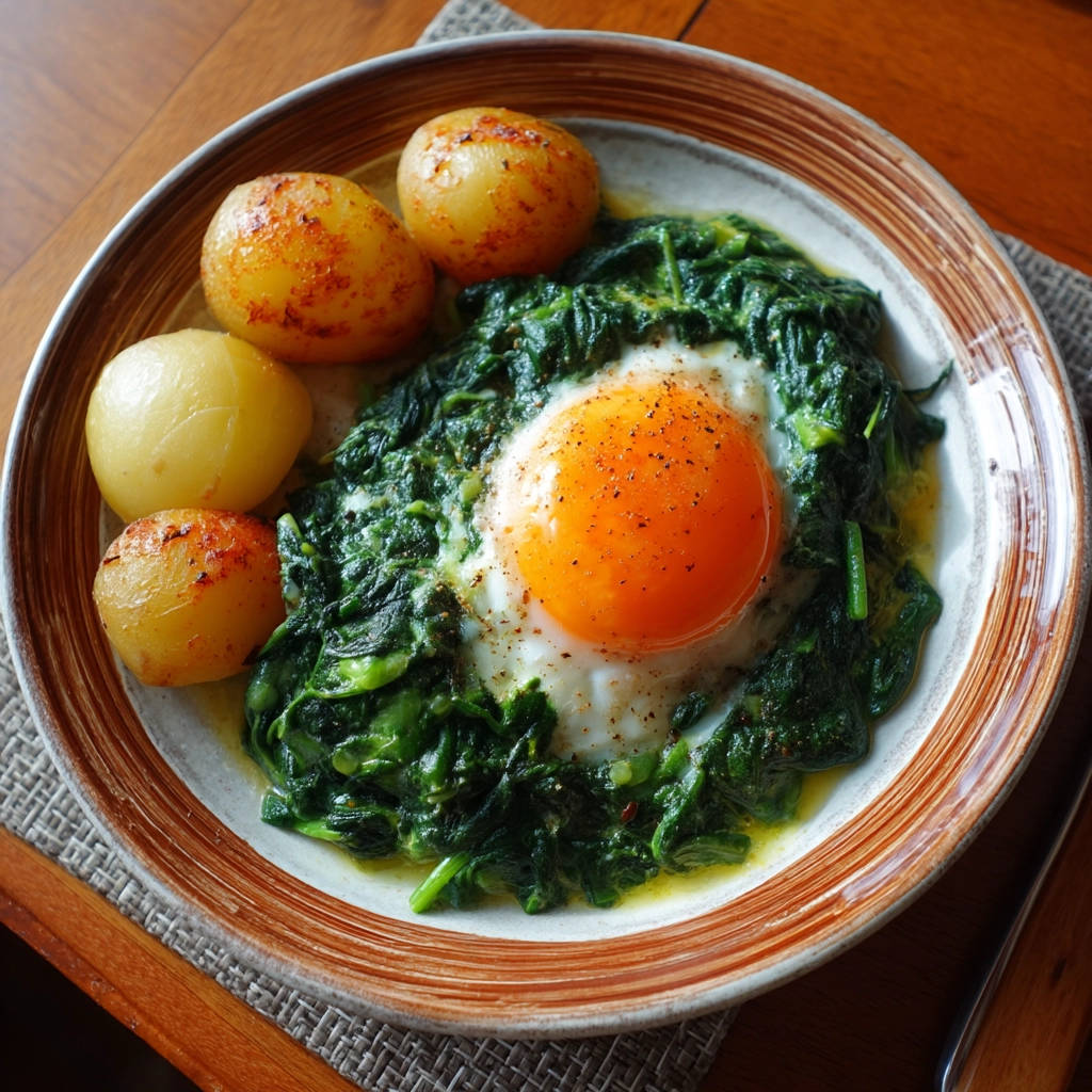 Genießen Sie Ihren hausgemachten Rahmspinat mit Kartoffeln und Eigelb!