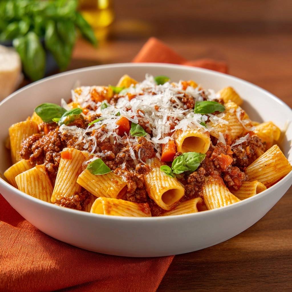 Stell dir vor, du beißt in die ersten Rigatoni Bolognese, und die dicke, fleischige Sauce klammert sich perfekt an die Pasta. Kein Tropfen läuft ab, nur purer Geschmack von gebratenem Hack und süßen Karotten, die alles binden. Der Duft steigt auf, tomatig und würzig, und du denkst: Endlich keine Suppe mehr!