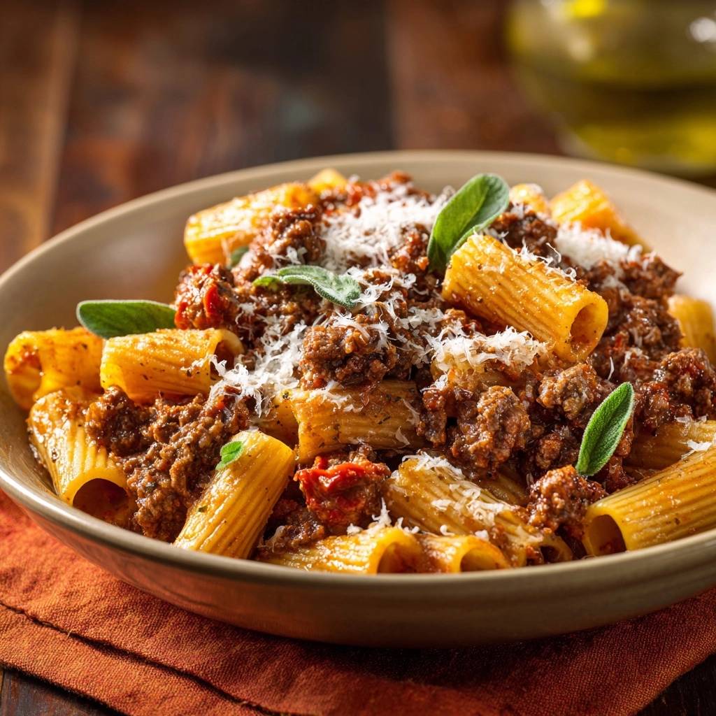 Rigatoni mit Hack-Tomaten-Ragù und Salbei (Keine wässrige Soße mehr)