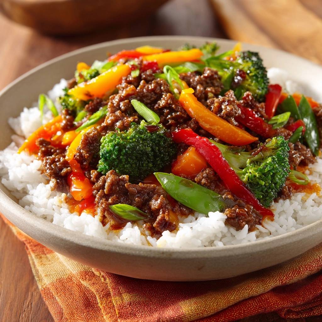 Rindfleisch-Gemüse-Pfanne mit Reis