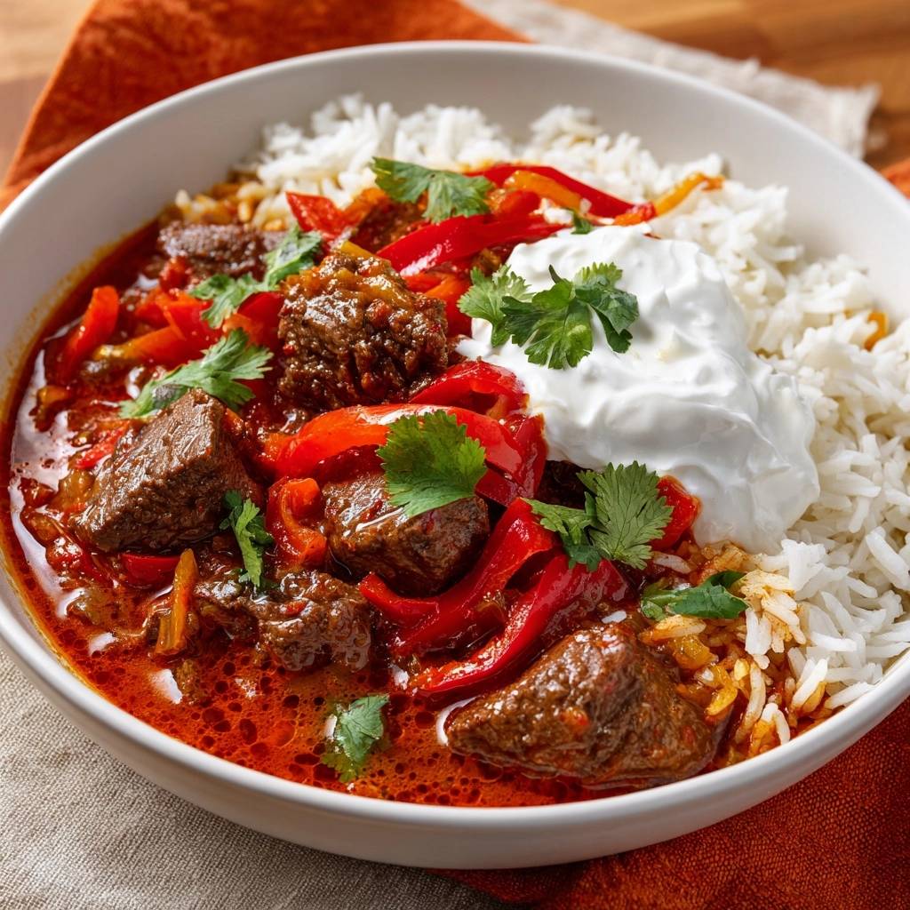 Stell dir vor, du öffnest den Topf und der Duft von roter Currypaste mischt sich mit süßem Paprikaaroma. Der erste Bissen: butterzartes Rindfleisch, das in cremiger Kokosmilch schmilzt, knackige Paprikastreifen und milder Joghurt-Reis dazu. Das ist pure Wärme auf dem Teller.