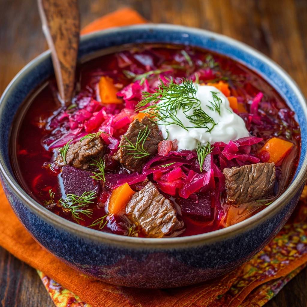 Stell dir vor, du tauchst den Löffel in eine tiefe Schale dampfenden Russischen Borschtsch. Die intensive rote Farbe der Rote Bete leuchtet dir entgegen, und der erste Bissen explodiert im Mund: zartes Rindfleisch, das butterweich zerfällt, knackiges Gemüse und eine Säure, die alles perfekt ausbalanciert.