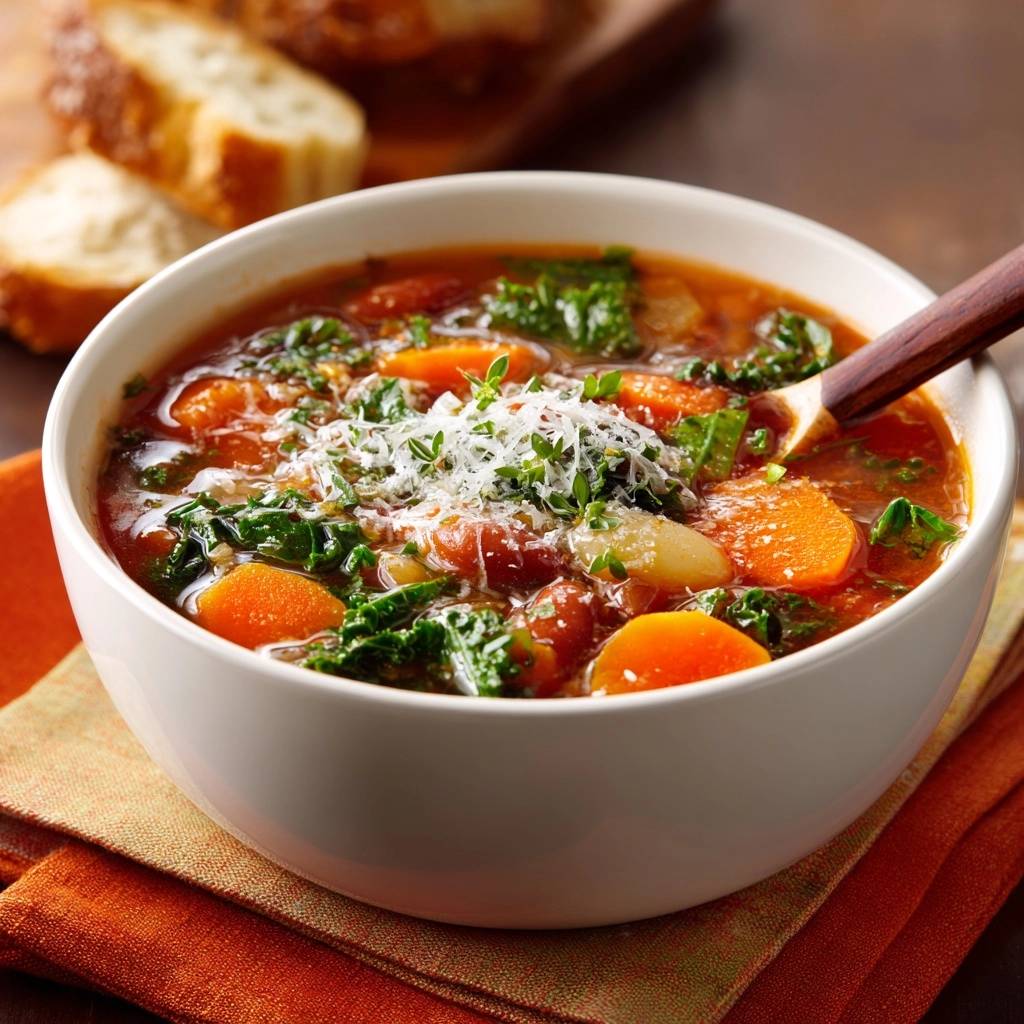 - Suppe in Schalen verteilen, mit geriebenem Parmesan bestreuen und mit frischem Brot servieren. Guten Appetit!