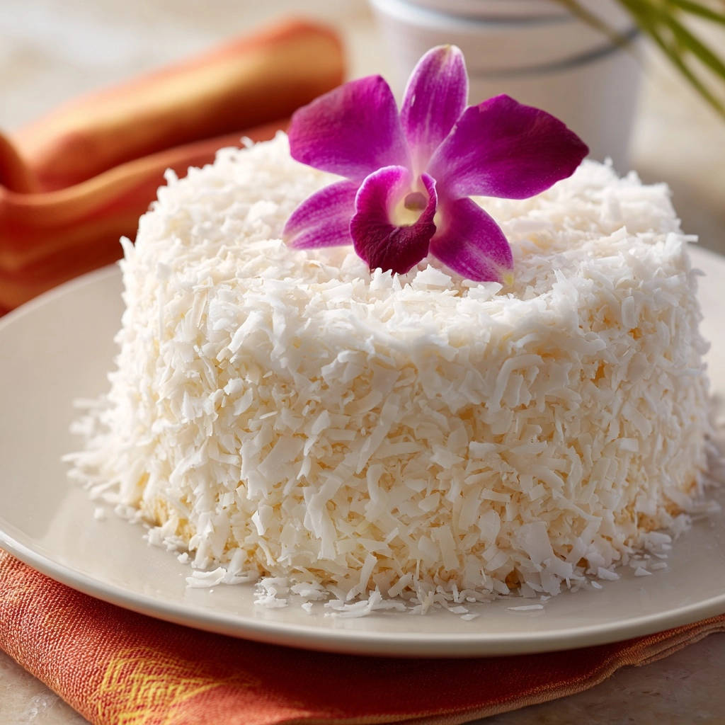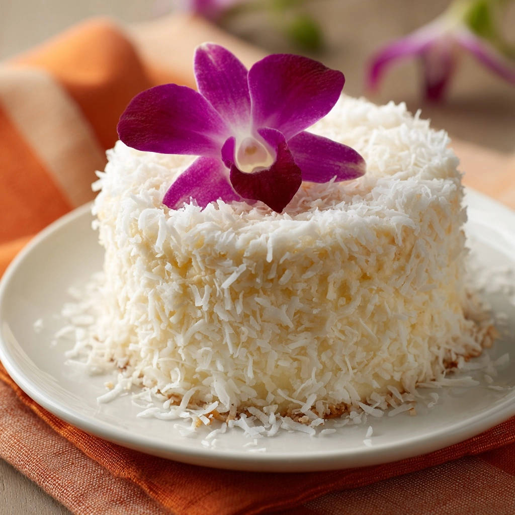 - Kühlen und Dekorieren: Den fertig dekorierten Kuchen vor dem Servieren für mindestens 1-2 Stunden im Kühlschrank fest werden lassen. Vor dem Servieren optional mit einer essbaren Blume, wie einer Orchidee, dekorieren, um den exotischen Look zu unterstreichen. Genießen Sie den saftigsten Kokoskuchen, den Sie je gebacken haben!