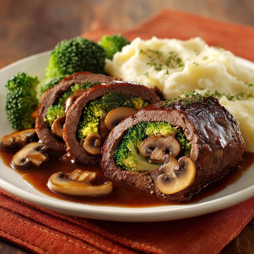 Saftige Pilz-Brokkoli-Rindfleischrouladen mit cremigem Püree