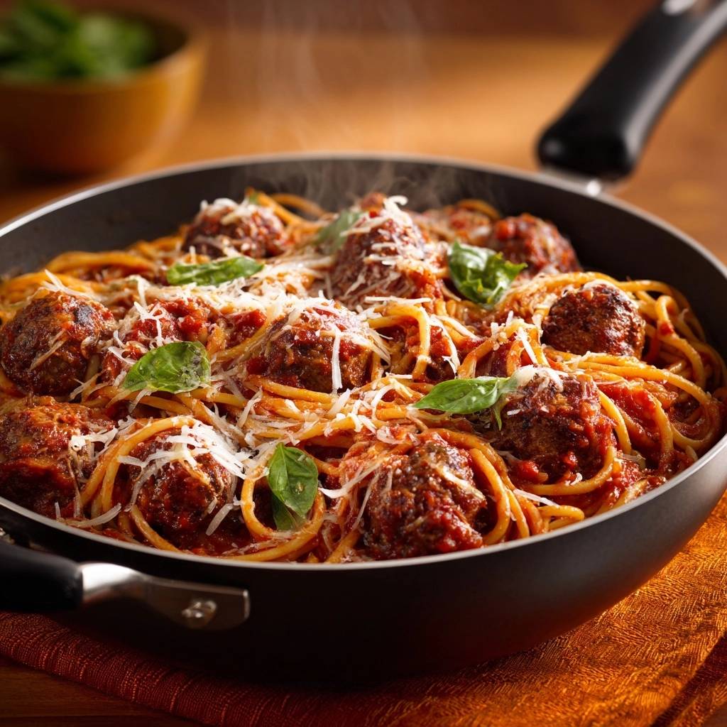 - Lege die Fleischbaellchen zurueck in die blubbernde Sauce. Gib die Spaghetti und einen Schuss Nudelwasser direkt in die Pfanne. Schwenke alles bei hoher Hitze fuer 2-3 Minuten, bis die Sauce die Nudeln komplett ummantelt und die gewuenschte cremige Konsistenz erreicht hat.