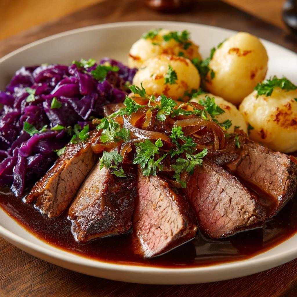 Der Duft von schmorendem Rindfleisch zieht durch die Küche, und beim ersten Bissen zerfließt es buttrig auf der Zunge. Saftiger Rinderbraten mit Rotkohl und Petersilienkartoffeln – das ist Sonntagsglück pur. Du beißt rein, und die Säfte quellen heraus, während der Rotkohl süß-säuerlich knirscht.