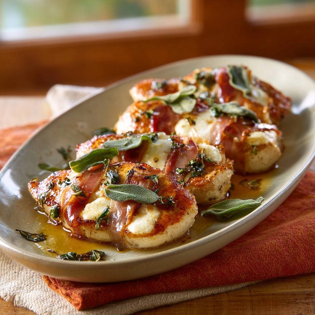 Stell dir vor, du schneidest durch eine goldbraune Kruste aus knusprigem Bacon und schmelzendem Mozzarella direkt in ein Stück Hähnchen, das so zart ist, dass es fast von selbst zerfällt. Der Duft von frischem Salbei steigt dir in die Nase und vermischt sich mit einer seidigen Sauce.