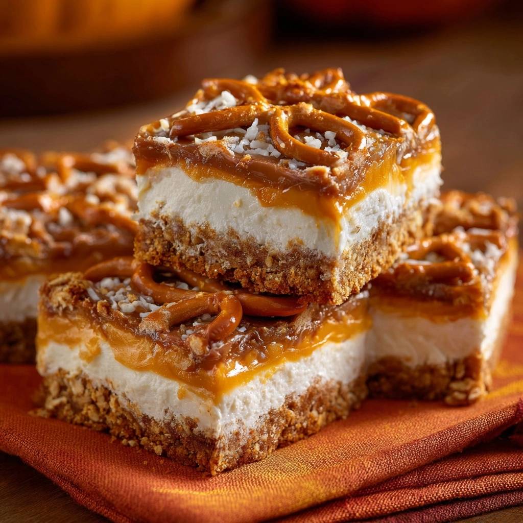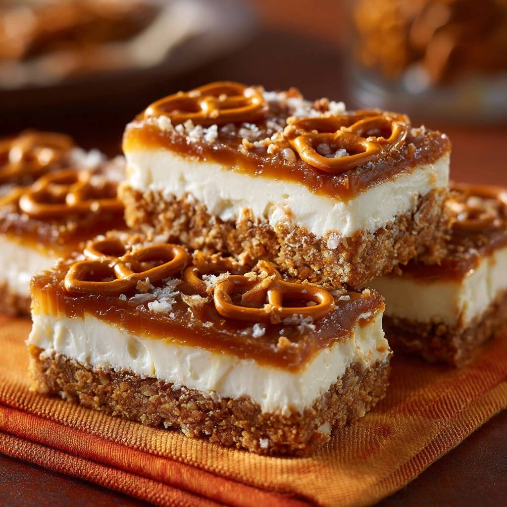 Diese Schnitten sind das ultimative Spiel mit den Gegensätzen. Du bekommst die Salzigkeit der Brezeln, die Süße des Karamells und die Frische des Frischkäses in einem einzigen Bissen.
