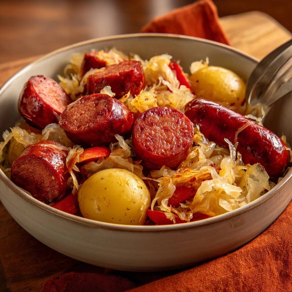 Ja, leicht. Nimm vegane Paprikawurst oder geräucherten Tofu in Scheiben. Brate sie genauso an, bis Fett austritt. Für Extra-Würze Paprikapulver und Rauchsalz hinzufügen. Das Kraut und Kartoffeln bleiben gleich. Ergebnis: Vollkommen knackig und geschmacksintensiv, ohne Tierisches. Nährwerte sinken leicht auf 350 kcal pro Portion.