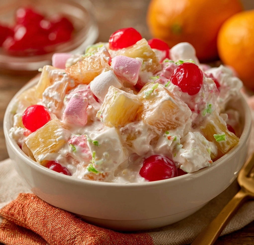 Stell dir vor: die spritzige Süße von Ananas und Mandarinen, gepaart mit den leicht herben Noten der Maraschino-Kirschen, umhüllt von einer luftig-leichten Sahne-Joghurt-Creme. Die Mini-Marshmallows sorgen für eine spielerische Textur und zusätzliche Süße.