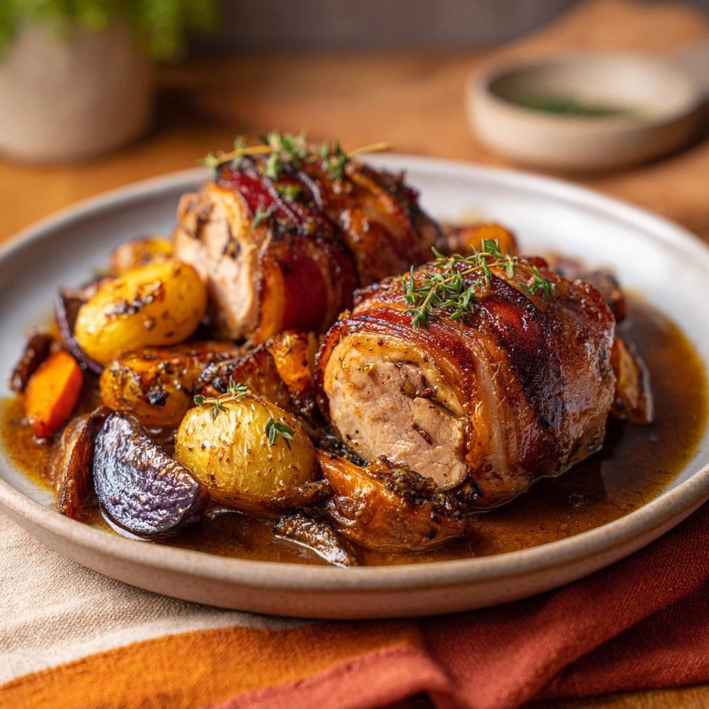 Speckmantel-Hähnchen mit Ofengemüse