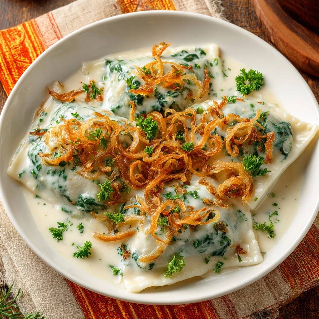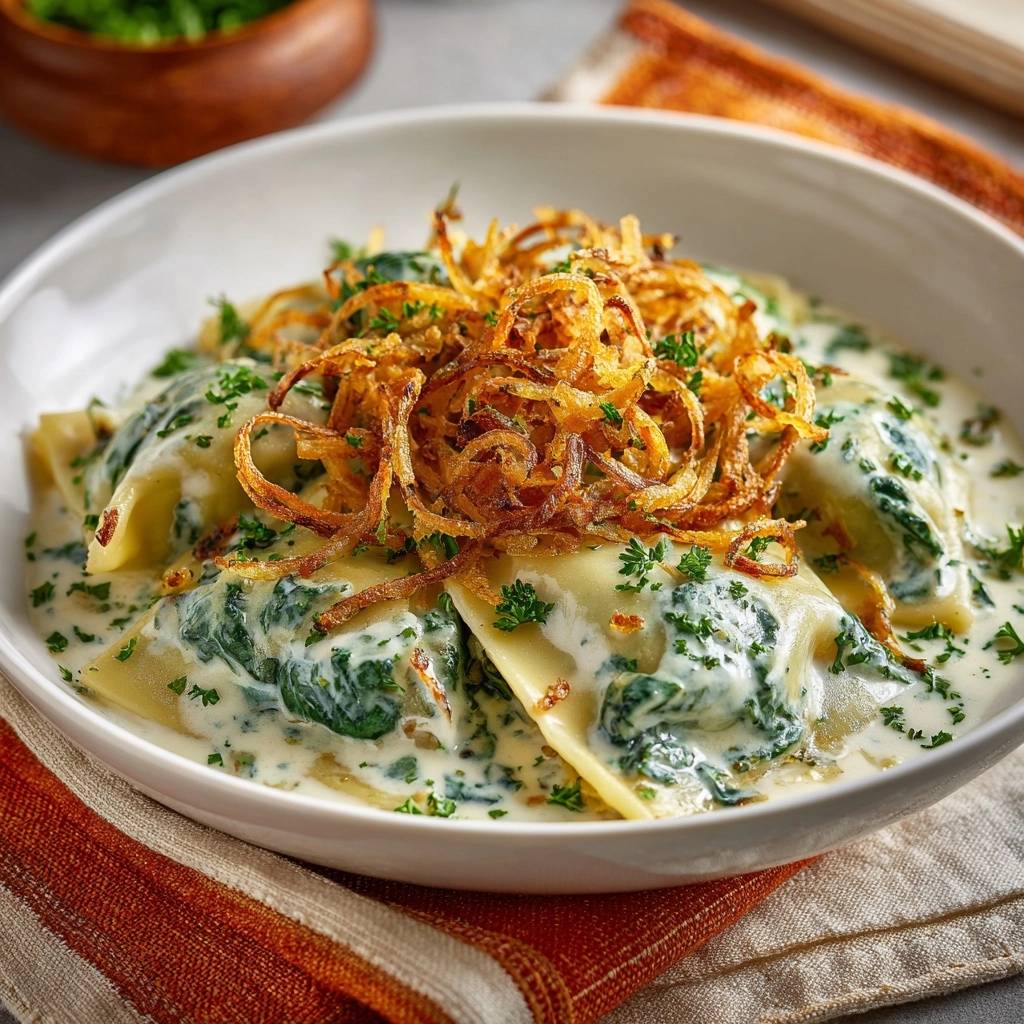 Spinatravioli in cremiger Soße mit knusprigen Zwiebeln