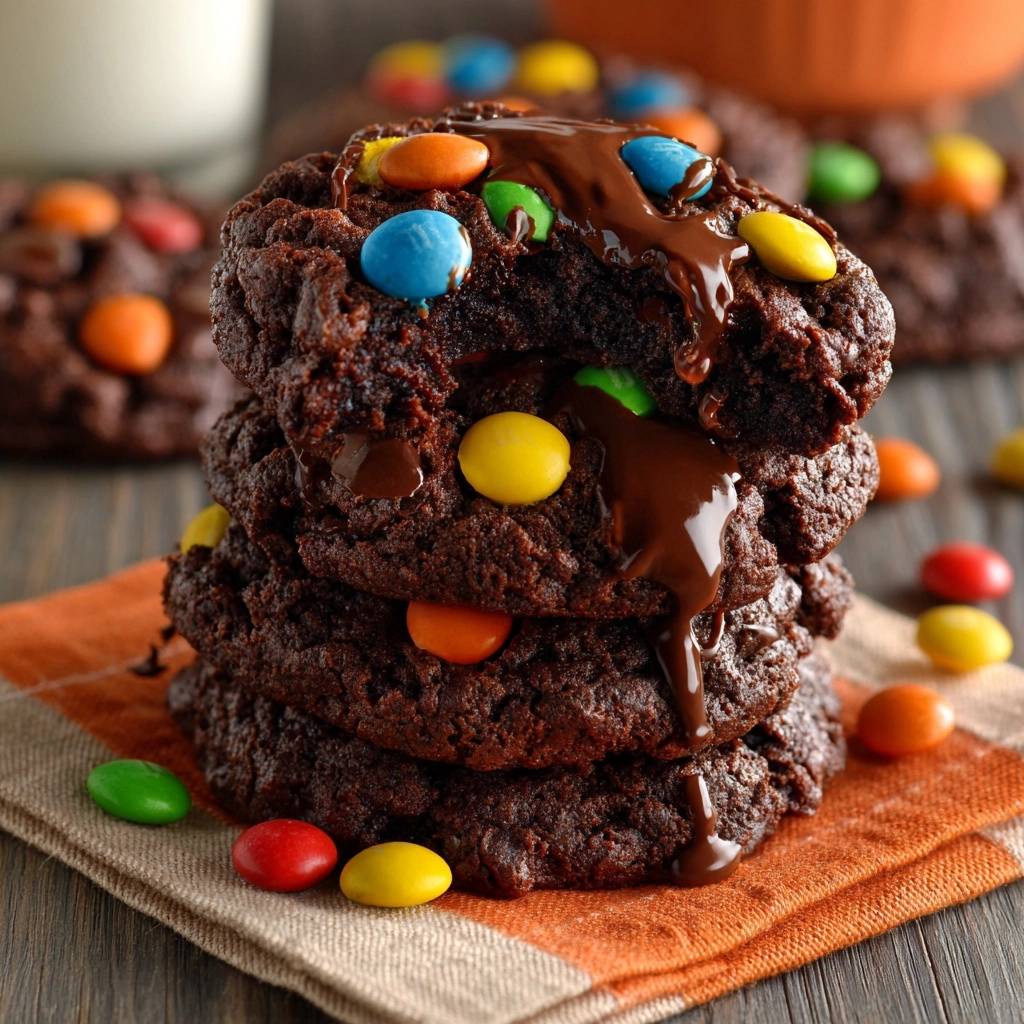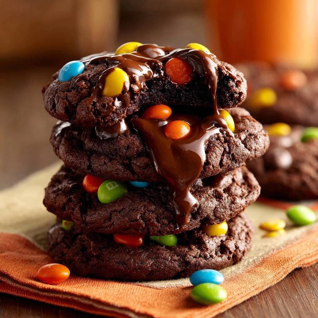 Drücke die restlichen Schokolinsen sofort nach dem Backen in die noch weichen Cookies. So bleiben sie obenauf sichtbar und versinken nicht im dunklen Teig.