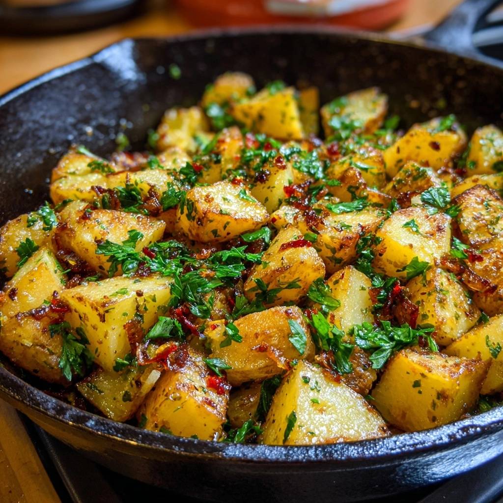 Nimm die Pfanne vom Herd und streue die frisch gehackte Petersilie darüber. Serviere die Kartoffeln direkt in der heißen Pfanne für den rustikalen Look.