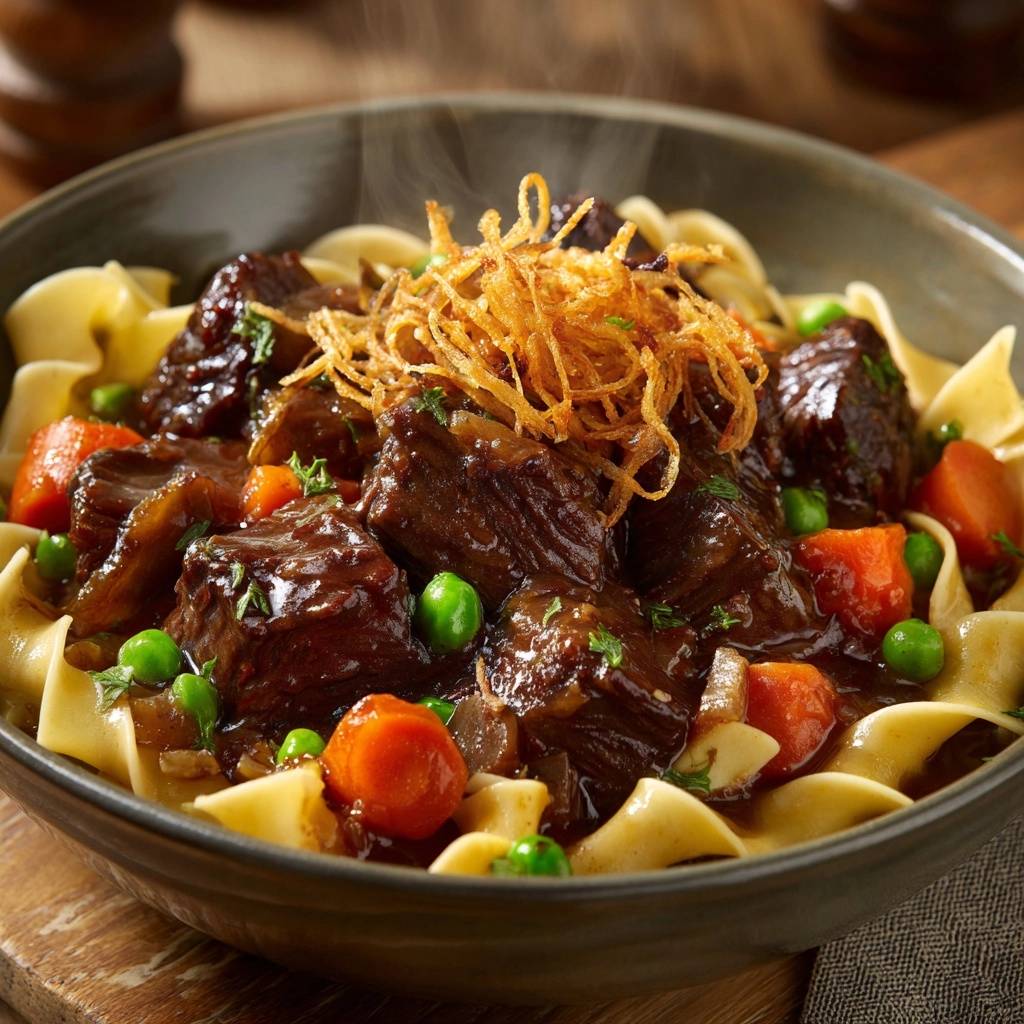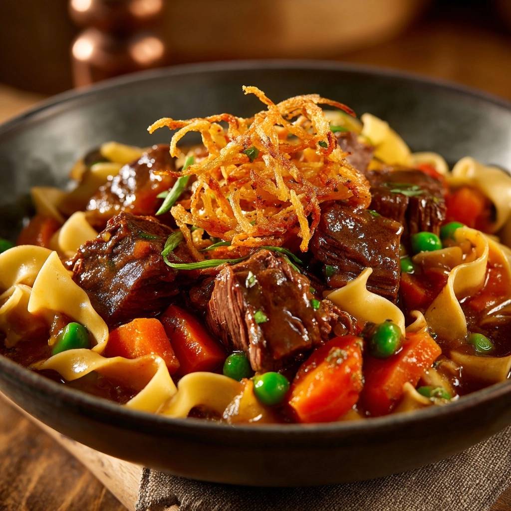 Die Karotten bringen Süße, Erbsen Frische, und die frittierten Zwiebeln oben drauf knacken herrlich. Jeder Bissen ist ein Genuss, der dich wärmt und sättigt. Du wirst staunen, wie einfach zartes Rindergulasch mit Bandnudeln wird, wenn du den Trick kennst.