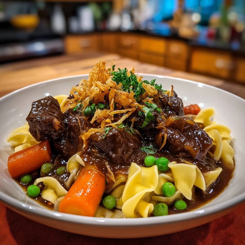 - Anrichten: Geben Sie eine großzügige Portion Nudeln in tiefe Teller. Verteilen Sie das Gulasch mit dem Gemüse darauf. Garnieren Sie das Gericht mit einer hohen Haube aus Röstzwiebeln und der frischen Petersilie für den perfekten Texturkontrast.