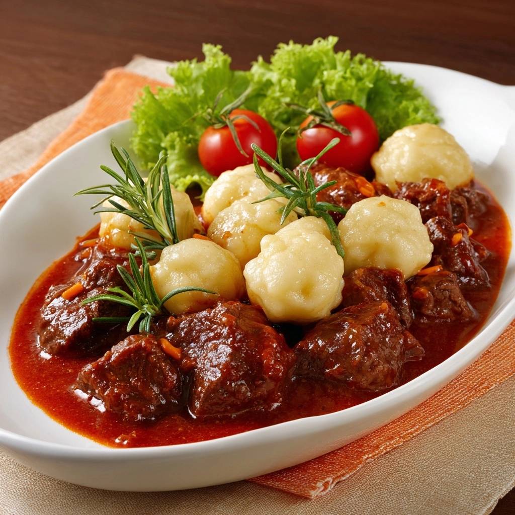 Zartes Rindergulasch mit gebräunten Kartoffelklößchen
