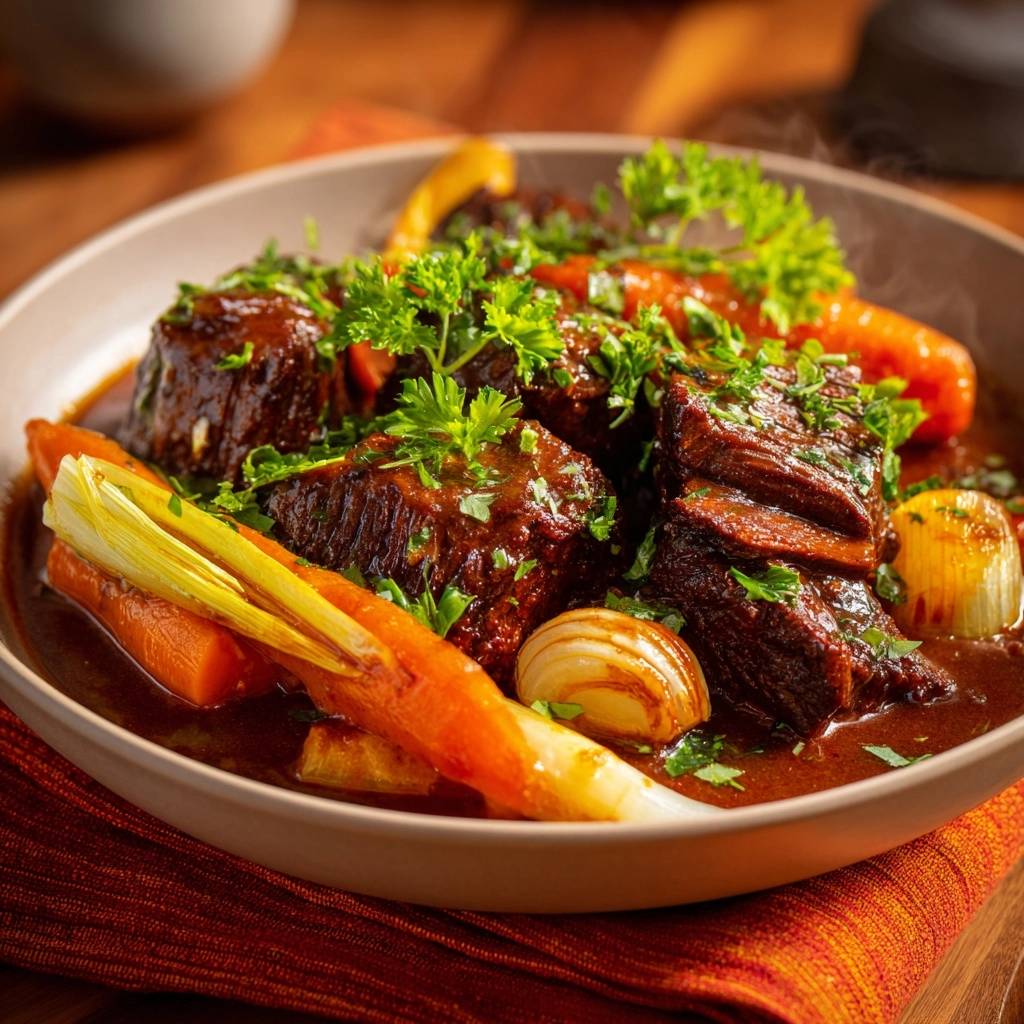 Der Duft steigt auf, als der Deckel aufgeht: intensiv, herzhaft, ein bisschen süß von den Perlzwiebeln. Du nimmst den ersten Löffel, und das Rindfleisch zerfällt butterzart auf der Zunge. Kein Faserchen zäh, nur pure Wärme, die dich umhüllt.