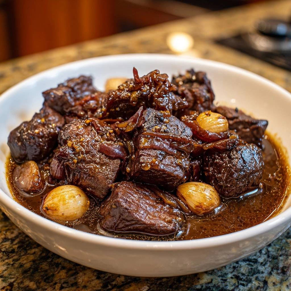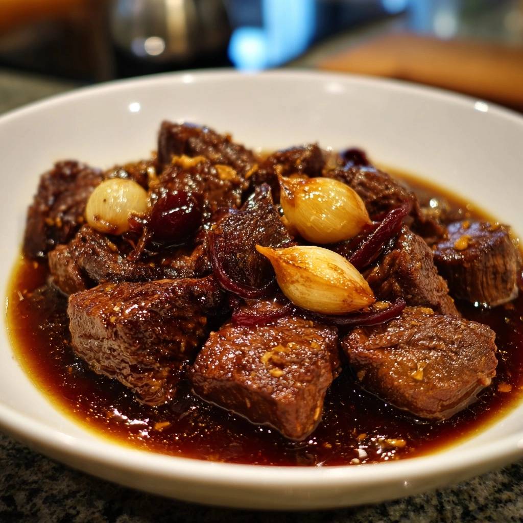 Stell dir vor, du nimmst die erste Gabel dieses zarten Rindfleischs mit ganzen Knoblauchzehen und roten Zwiebeln. Das Fleisch zerfällt butterweich, die Sauce umhüllt es glänzend, und der Duft von süßem Knoblauch mischt sich mit der Würze der Zwiebeln. Früher hab ich gekämpft mit zähem Gulasch, das stundenlang gekocht wurde und trotzdem hart blieb.