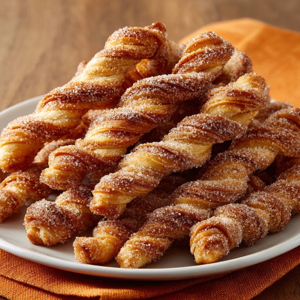 - Drehen der Stangen: Nehmen Sie jeden Teigstreifen vorsichtig an beiden Enden. Halten Sie ein Ende fest und drehen Sie das andere Ende spiralförmig ein, bis der gesamte Streifen eine gedrehte Form hat. Das Drehen verleiht den Stangen ihre charakteristische Form und hilft dabei, die Zimt-Zucker-Mischung noch besser zu fixieren.