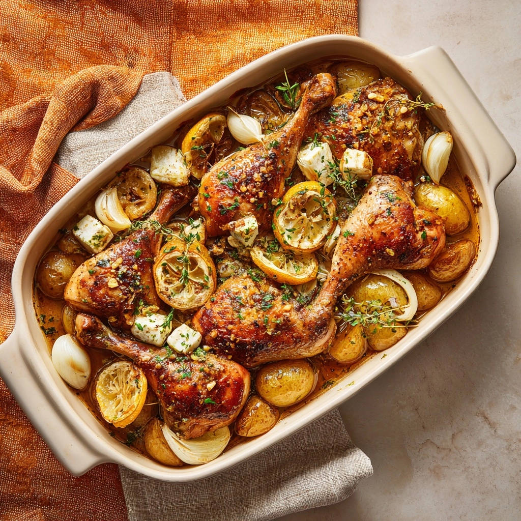 - Reduziert die Ofentemperatur auf 180°C und bratet das Gericht für weitere 30-40 Minuten, oder bis die Hähnchenkeulen goldbraun und durchgegart sind (Kerntemperatur ca. 80-82°C im dicksten Teil des Fleisches). Übergießt das Hähnchen alle 10-15 Minuten weiterhin mit dem Bratsaft. Etwa 10-15 Minuten vor Ende der Garzeit die Feta-Würfel über das Gericht streuen.
