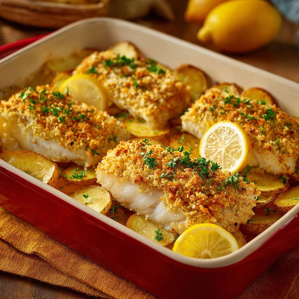 Stell dir vor, du schneidest durch eine goldgelbe, krachend laute Kruste direkt in ein schneeweißes, saftiges Fischfilet. Der Duft von frischer Zitrone und sanft geröstetem Knoblauch steigt dir in die Nase, während die Kartoffeln am Boden der Form die feinen Säfte aufgesogen haben.