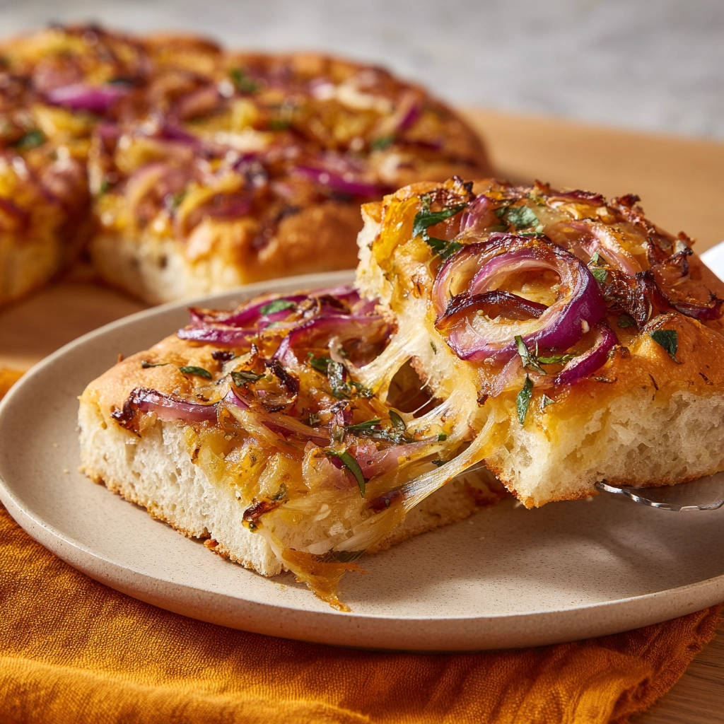 Genießt eure hausgemachte Zwiebel Focaccia mit Käse!